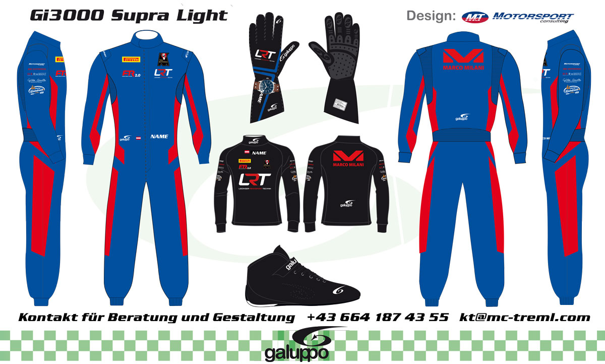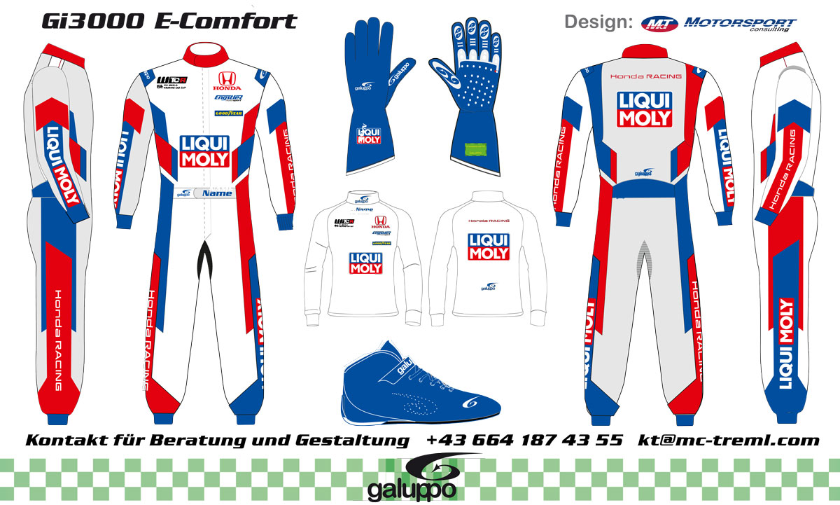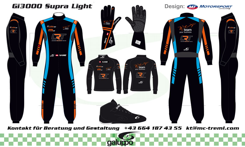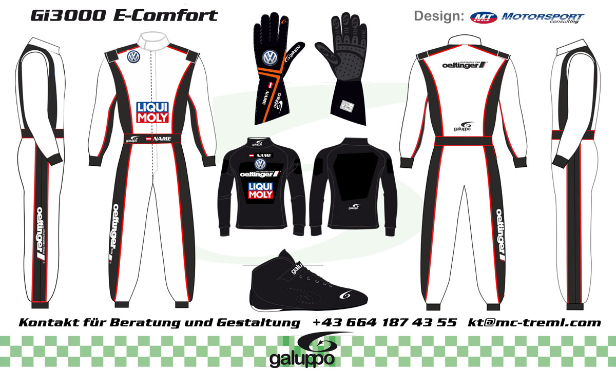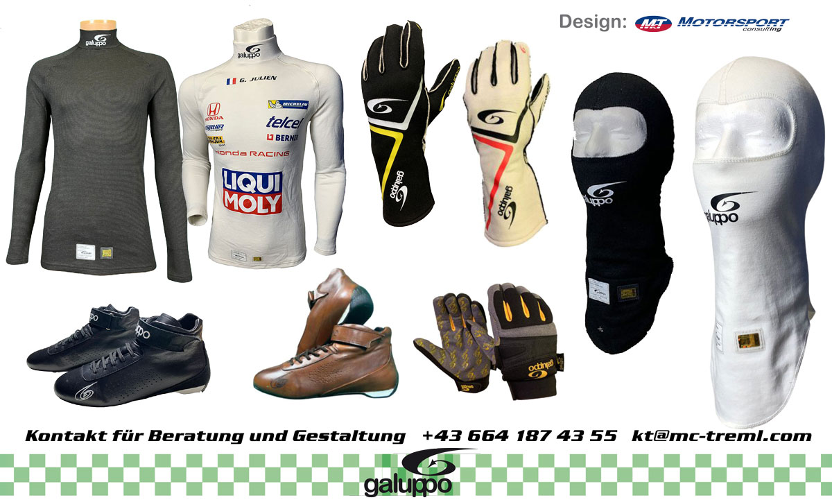 GALUPPO bietet zudem exklusive Designs. Kreieren Sie gemeinsam mit uns ein einzigartiges Outfit in ihren Wunschfarben und denen ihrer Werbe- bzw. Geschäftspartnern und ihren Sponsoren. Selbstverständlich unter strikter Einhaltung der neuesten FIA-Sicherheitsbestimmungen.
